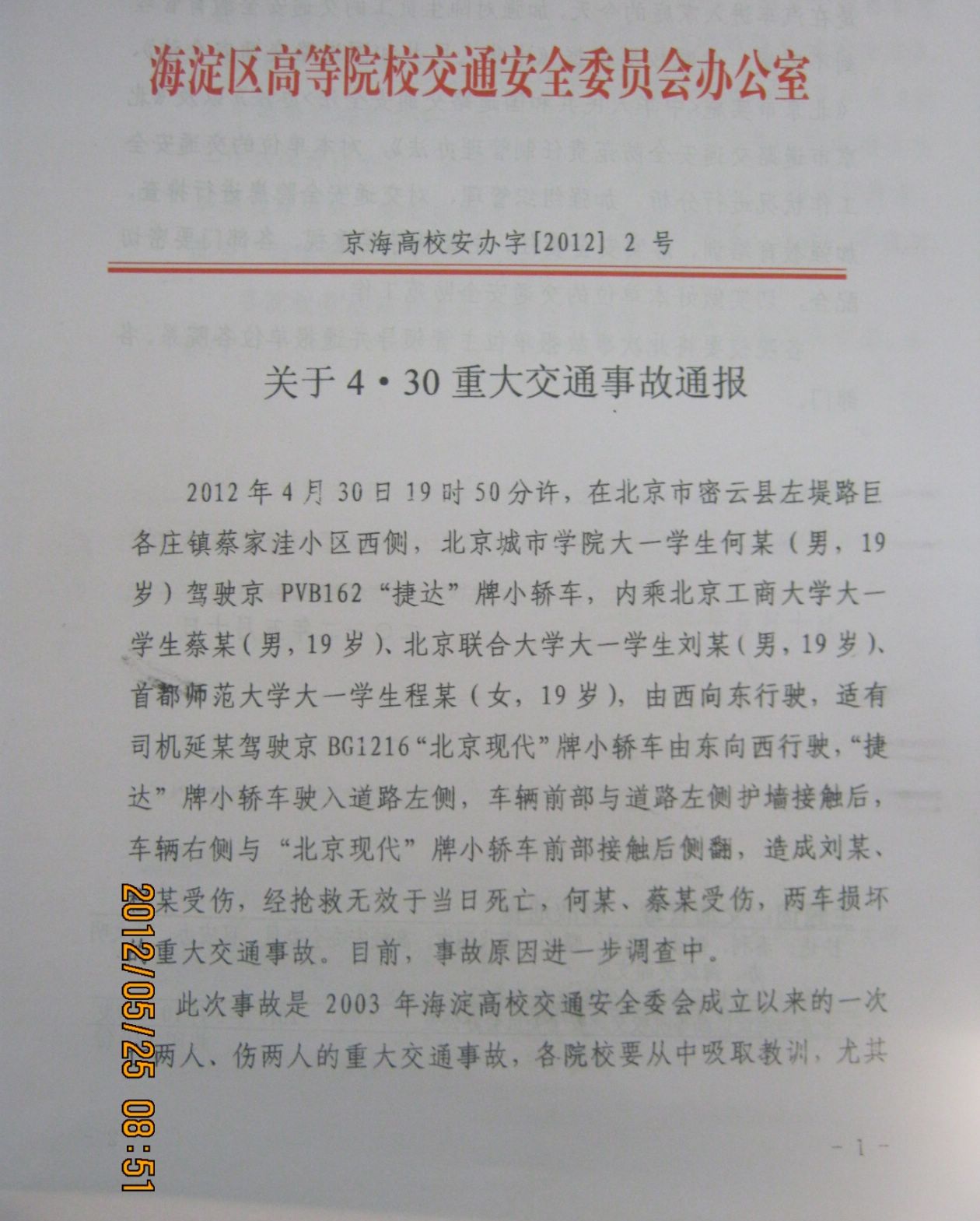 4月30日,在北京市密云县发生一起重大交通事故,车内所乘4名大学生死亡两人、重伤两人,详情见附件。