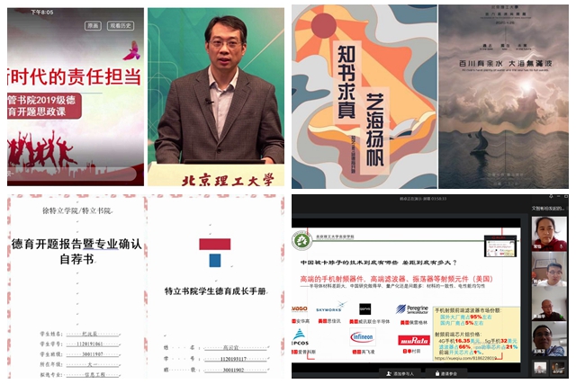 各书院坚持以习近平新时代中国特色社会主义思想为指导,以立德树人为根本,以理想信念教育为核心,以学生疫情防控期间所闻、所见、所思、所想为切入点,通过学生交流分享、教师点评指导、布置德育作业等多种手段开展各具特色的系列活动,教育引导学生以“大我”定位“小我”,以国家需要指引人生航向,切实激发求学报国的内生动力。精工书院通过与专业宣传月相结合等多种形式,鼓励学生探索自我价值、社会属性,结合爱国情怀和社会需要树立人生理想;睿信书院鼓励学生思考当下,畅想未来,确立人生坐标,撰写自己的未来“剧本”,做大学生活的导演;求是书院将北理工八十年的校史校情融入到求是书生的德育开题工作中,以史为鉴,助力学生成长成才;明德书院围绕“立德”二字,结合书院“礼、乐、射、御、书、数”的“六艺”培养体系,引导学生树立目标、认识自我、思考人生;经管书院通过开展“云端致远大讲堂”“云端经管有约”“云端辩论赛”“十年后的我”“云端共克时艰、历练成长”等主题分享会,启发激励学生深入认识自我、探索未来方向;知艺书院通过接力添画的方式凝心聚力,结合自身思考,在线上共同完成一幅幅带有班级特色的画作;特立书院组织学生制定个人德育成长档案和班级海报,并以视频的方式记录下每位同学对自己大学四年的成长寄语;北京书院从责任担当、专业前景、能力训练、学习风气、学期总结及未来规划以及疫情期间感受等六方面引导同学们认真规划大学生活及未来发展。