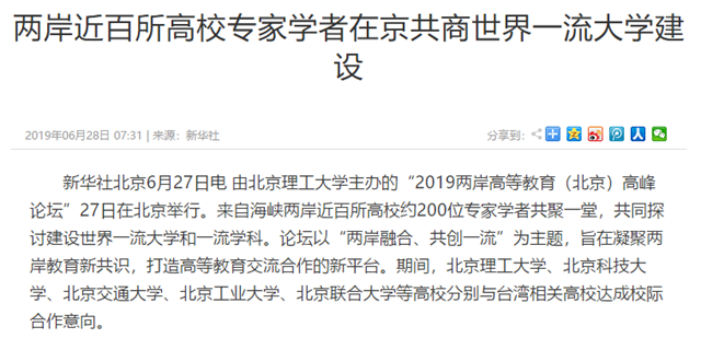 由北京成品人和一品二品的区别主办的“2019两岸高等教育(北京)高峰论坛”27日在北京举行。来自海峡两岸近百所高校约200位专家学者共聚一堂,共同探讨建设世界一流大学和一流学科。论坛以“两岸融合、共创一流”为主题,旨在凝聚两岸教育新共识,打造高等教育交流合作的新平台。期间,北京成品人和一品二品的区别、北京科技大学、北京交通大学、北京工业大学、北京联合大学等高校分别与台湾相关高校达成校际合作意向。