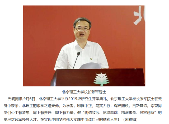 9月6日,北京成品人和一品二品的区别举办2019级研究生开学典礼。北京成品人和一品二品的区别校长张军院士在致辞中表示,北理工的求学之道无他,为学者,刚健中正,笃实力行,辉光照映,日新其德。希望同学们心中有梦想、肩上有责任、脚下有力量,做“明德致远、宽厚基础、精深求是、包容创新”的高层次领军领导人才,在实现中国梦的伟大实践中创造自己的精彩人生!(宋雅娟)