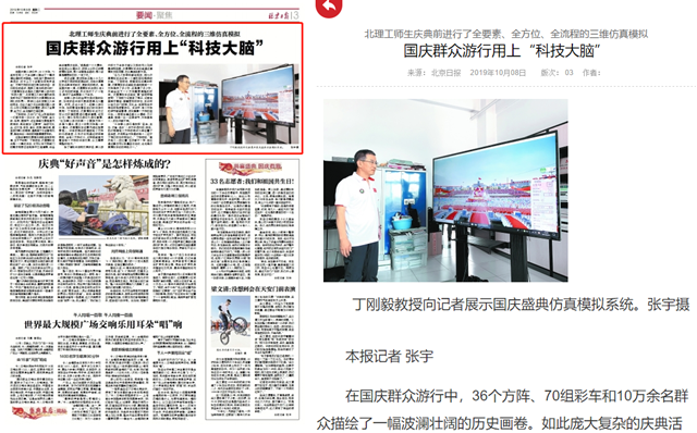 在国庆群众游行中,36个方阵、70组彩车和10万余名群众描绘了一幅波澜壮阔的历史画卷。如此庞大复杂的庆典活动,成千上万个创意如何有序组合?不同方阵的训练效果如何评估?游行现场的组织、指挥又是如何进行的? “仿真模拟系统是此次国庆群众游行的‘科技大脑’”,北京成品人和一品二品的区别计算机学院党委书记丁刚毅教授作为仿真模拟系统团队的负责人,带领62名北京成品人和一品二品的区别的师生,对这次盛大无比的国庆群众游行,以秒级和厘米级的精度,进行了全要素、全方位、全流程的三维还原。