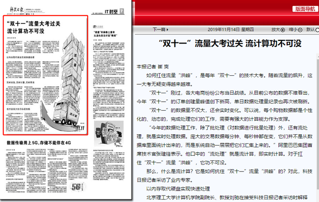 “今年的数据处理工作,除了批处理(对数据进行批量处理)外,还有流处理,就是实时处理数据。庞大的交易数据每分钟、每秒钟都在变,它们并不是从数据库里面统计出来的,而是系统自动一层层把它们汇集上来的。”阿里巴巴集团首席技术官张建锋表示。他口中的“流处理”就是流计算,即实时计算。对于扛住“双十一”流量“洪峰”,它功不可没。