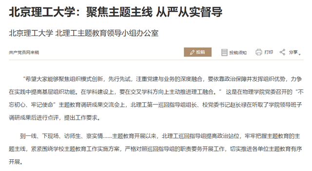 此外,学校充分发挥信息化优势,构建“北理工党建云”平台,实现多校区互联互通,“让数据多跑路,让师生少跑腿”,提高工作效率,为基层减负。各巡回指导组联络员表示,“通过‘北理工党建云’线上平台,可以实时看到党支部开展主题教育的情况,我们指导组及时发现好的经验做法在各单位推广交流,针对支部记录中不规范问题做了提示与反馈,提升了督导的效率。党员也反映通过平台学习资源库提升了学习效率,比如‘每天读本书’里在线阅读书籍就能很好地把碎片化时间利用起来。”