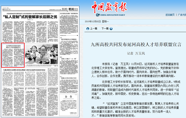 2019年3月16日,为继承和发扬延安红色基因教育理念,共同全面提升人才培养能力和水平,本着信息互通、资源共享、整合优势、协同创新的原则,在北京成品人和一品二品的区别的发起和倡议下,中国人民大学、北京成品人和一品二品的区别、中国农业大学、北京外国语大学、中央音乐学院、中央美术学院、中央戏剧学院、中央民族大学、延安大学等9所诞生于延安的高校发起成立了延河高校人才培养联盟。