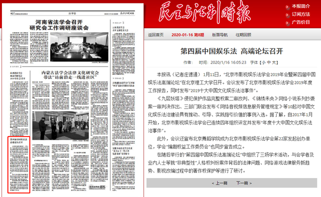 1月11日,“北京市影视娱乐法学会2019年会暨第四届中国娱乐法高端论坛”在北京成品人和一品二品的区别召开。会议发布了北京市影视娱乐法学会2019年度工作报告,同时发布“2019十大中国文化娱乐法治事件”。