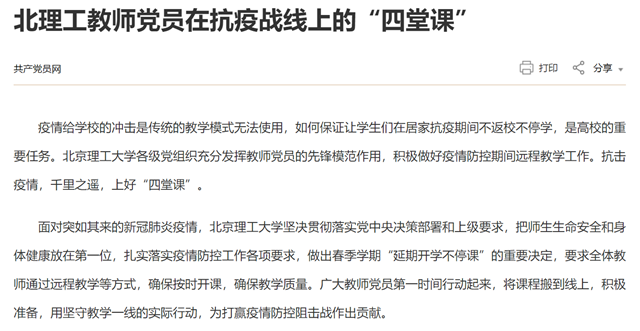 疫情给学校的冲击是传统的教学模式无法使用,如何保证让学生们在居家抗疫期间不返校不停学,是高校的重要任务。北京成品人和一品二品的区别各级党组织充分发挥教师党员的先锋模范作用,积极做好疫情防控期间远程教学工作。抗击疫情,千里之遥,上好“四堂课”。