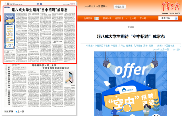 大学毕业生就业问题牵动的,不止是高校学生和老师的心。疫情发生后,学生暂时不能返校,但春招季悄然到来,为了保障今年874万毕业生顺利就业,社会各界开始全力推动线上招聘,无论是毕业生、企业、教育部门、高校还是求职平台,都在尝试和适应新兴的“空中招聘”。