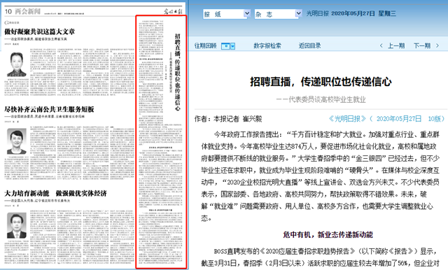今年政府工作报告提出:“千方百计稳定和扩大就业。加强对重点行业、重点群体就业支持。今年高校毕业生达874万人,要促进市场化社会化就业,高校和属地政府都要提供不断线的就业服务。”大学生春招季中的“金三银四”已经过去,但不少毕业生还在求职中,就业成为毕业生现阶段难啃的“硬骨头”。在媒体与校企深度互动中,“2020企业校招光明大直播”等线上宣讲会、双选会方兴未艾。不少代表委员表示,国家部委、各地政府、高校共同努力,帮扶政策取得不错效果。未来,破解“就业难”问题需要政府、用人单位、高校多方合作,也需要大学生调整就业心态。