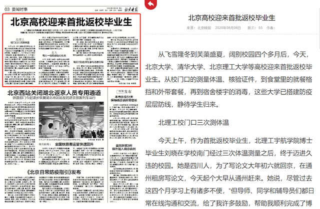 今天上午,作为首批返校毕业生,北理工宇航学院博士毕业生刘晓在学校南门经过三次体温测量之后,终于迈进久违的校园。她是四川人,为了写论文大年初六就回京,在通州租房写论文,今天起个大早从通州赶来。她说,尽管过去这四个月学习上有诸多不便,“但导师、同学和辅导员们都日常在线沟通和交流,给了我许多鼓励,帮助我顺利完成了博士论文写作和返校准备工作。”她希望好好珍惜剩下的校园时间,精心准备毕业答辩,和老师同学们道个别。