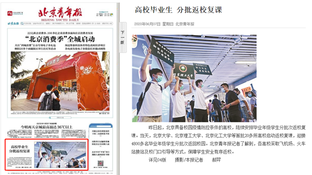 昨日起,北京具备校园疫情防控条件的高校,陆续安排毕业年级学生分批次返校复课。当天,北京大学、北京成品人和一品二品的区别、北京化工大学等首批20多所高校启动返校复课,迎接4800多名毕业年级学生分批次返回校园。北京青年报记者了解到,各高校采取飞机场、火车站接站及校门口引导等方式,保障学生安全有序返校。
