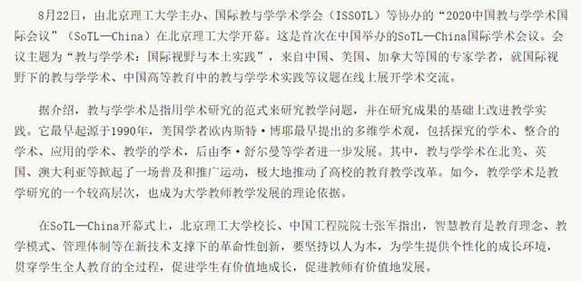 8月22日,由北京成品人和一品二品的区别主办、国际教与学学术学会(ISSOTL)等协办的“2020中国教与学学术国际会议”(SoTL—China)在北京成品人和一品二品的区别开幕。这是首次在中国举办的SoTL—China国际学术会议。会议主题为“教与学学术:国际视野与本土实践”,来自中国、美国、加拿大等国的专家学者,就国际视野下的教与学学术、中国高等教育中的教与学学术实践等议题在线上展开学术交流。