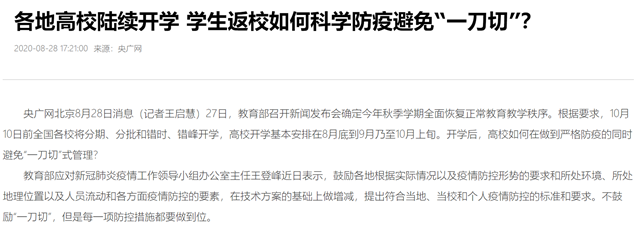 27日,教育部召开新闻发布会确定今年秋季学期全面恢复正常教育教学秩序。根据要求,10月10日前全国各校将分期、分批和错时、错峰开学,高校开学基本安排在8月底到9月乃至10月上旬。开学后,高校如何在做到严格防疫的同时避免“一刀切”式管理?