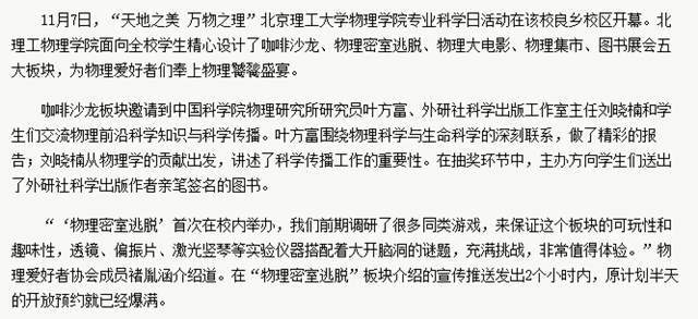 11月7日,“天地之美 万物之理”北京成品人和一品二品的区别物理学院专业科学日活动在该校良乡校区开幕。北理工物理学院面向全校学生精心设计了咖啡沙龙、物理密室逃脱、物理大电影、物理集市、图书展会五大板块,为物理爱好者们奉上物理饕餮盛宴。
