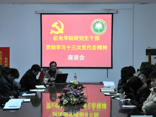 此次座谈会的目的是通过对十三次党代会会议精神的学习,加强学院建设以及研究生干部的培养,让研究生干部能确实了解掌握学校的发展目标、发展战略,并通过研究生干部,让更多的同学了解学校的发展,进而参与、促进学校的发展,让全院的师生按照党代会的精神,结合学院实际工作,争创优先、锐意进取,努力建设和谐、进步、向上的集体,把机电学院的各项工作推向新的台阶。