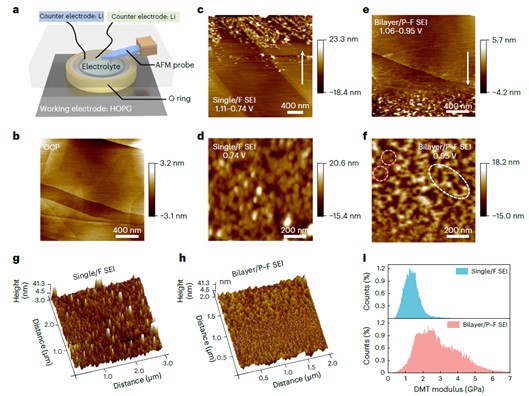 图4. 原位电化学原子力显微镜分析了SEI的形成过程和力学稳定性。(a)原位电化学AFM电池示意图。(b) HOPG在OCP (3.0 V)下的AFM形貌图。循环伏安法扫描(c, d)单层SEI和 (e, f)双层SEI的AFM形貌图。(g)单层SEI和 (h) 双层/SEI的高度图像。(i)单层SEI和双层SEI的DMT模量分布。