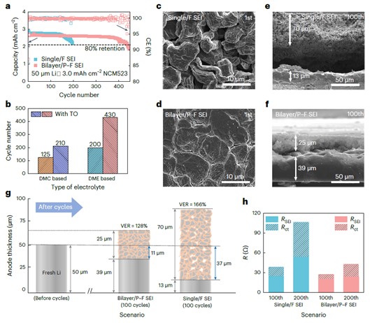 图5. 不同SEI对锂金属扣式电池循环稳定性、锂形态和界面动力学的影响。(a)不同SEI中Li | NCM523扣式电池的循环性能,(b)不同电解液中,Li | NCM523电池的循环性能比较。(c, e) 单层 SEI和 (d, f) 双层SEI在循环过程中的SEM俯视图和截面图。(g)循环100次后,锂负极的结构演变及体积膨胀。(h) Li | NCM523电池在单层SEI和双层SEI中阻抗演变。