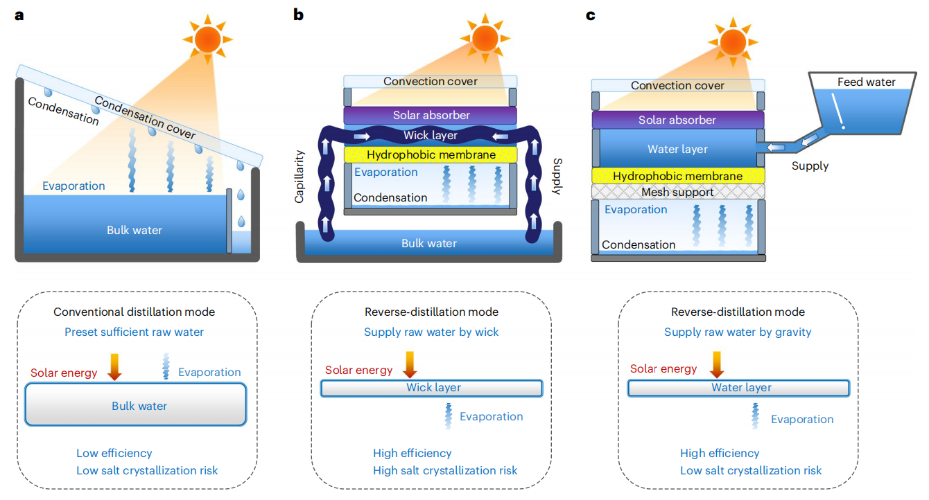 图1. 太阳能驱动的蒸馏模式 (a)传统蒸馏;(b)基于亲水材料的逆向蒸馏;(c)基于水层的逆向蒸馏