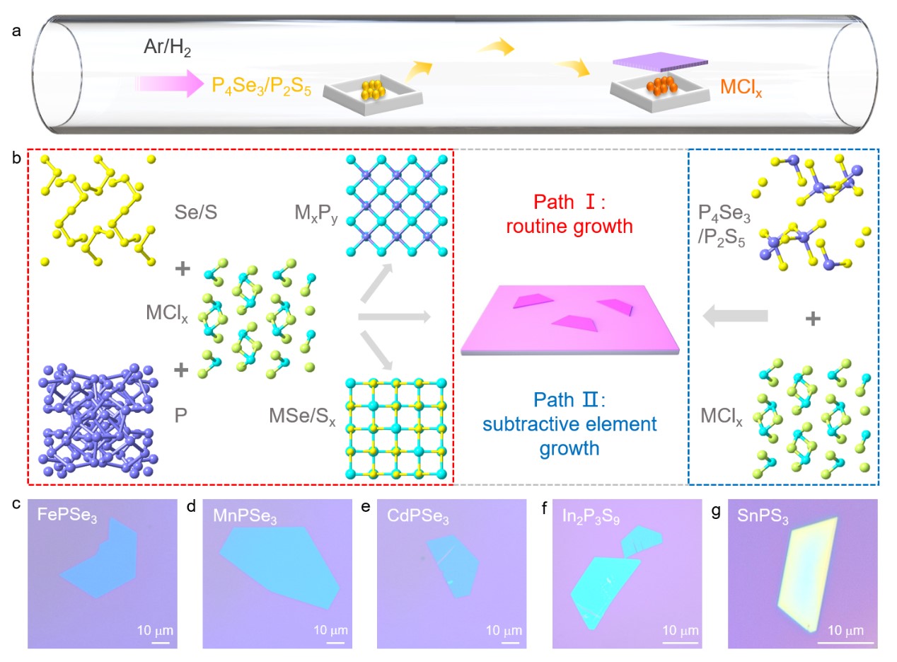编辑:王莉蓉 审核:陈珂 阅读次数:过渡金属磷硫化合物(TMPCs)是一大类包含三种及以上元素的二维层状材料,通常具有类似CdCl2晶体的准六方结构,由于独特的电子结构和优异的光学、电子、光电、磁性和催化性能而引起了广泛的研究兴趣。然而,大多数关于二维TMPCs的研究主要通过液相剥离或机械剥离大块晶体实现。迄今为止,通过化学气相沉积(CVD)方法直接合成超薄TMPCs仍然具有挑战性。首先,TMPCs通常由过渡金属(TM)、磷(P)和硫/硒(X)组成,层间通过范德华力相互作用。金属源P和S/Se通常用作前驱体,而P具有较高的化学反应活性,价态丰富,可形成TMPCs、MP、PaXb等化合物。因此,TMPCs的制备很难控制。其次,三种前驱体的共挥发不可控使得三元TMPCs的合成比二元材料更困难。因此,迫切需要开发一种通用的合成方法制备高质量的晶体,以研究其性质和应用。
