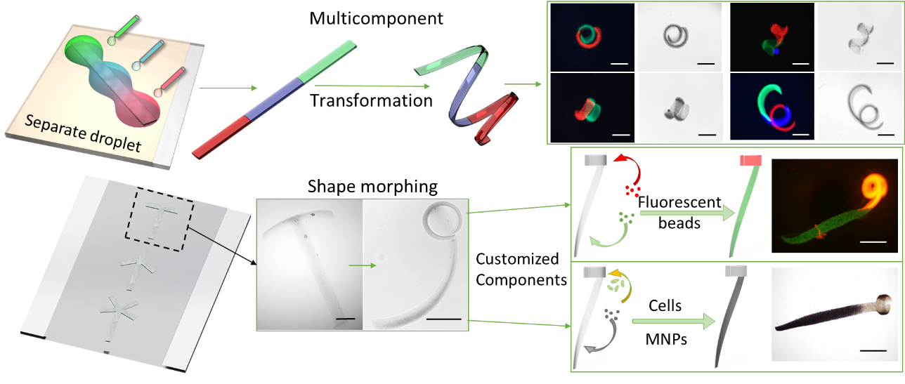 该团队在前期研究自形变褐藻酸微机器人的基础上(Nature Communications, vol. 12(1), 2021. http://doi.org/10.1038/s41467-020-20697-w),进一步探索了褐藻酸液体如何在非均一电场作用下固化为不同大小网格结构组成的凝胶体。发现这些网格结构不仅在受到离子浓度、pH值变化激励时能够膨胀、收缩使凝胶整体展现出特定的形变特征,还能像一张网包络嵌入各种径粒大小的成分。该发现激发了团队研发能够集成不同形变模式、功能成分的模块化微机器人的灵感。