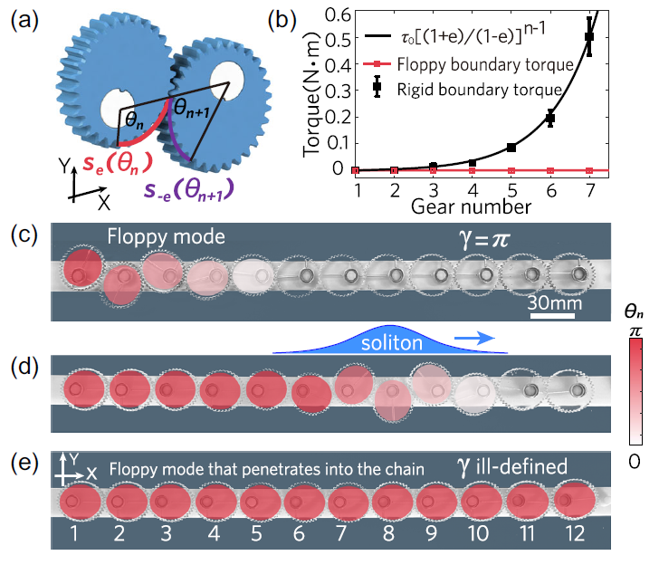 图1 (a):椭圆齿轮链单元;(b)椭圆齿轮链扭矩对比及其与齿轮数的关系;(c)软模在左侧,左边可以自由扭动;(d)孤子波传播;(e)软模在右侧,右侧可以自由扭动。