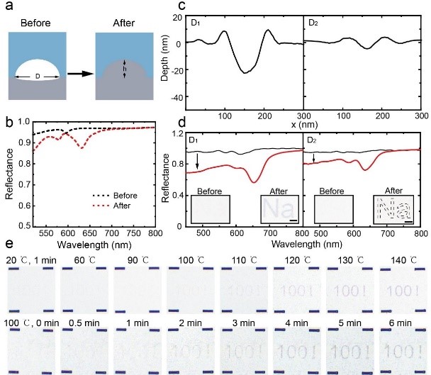 借助这一液态金属纳米形变诱发的光谱变化机制,研究人员构造了在可见波段响应的等离激元结构色超表面(图3)。可以看到,在对器件进行加热后,颜色发生了明显的变化。进一步的,研究人员通过控制石英纳米微孔的大小,开发了一种具有“隐形墨水”功能的钠超表面器件。如图4所示,当石英微孔足够小时,反穹顶结构的曲率能够大大增加,从而接近于平面,使得反射光谱接近于镜面反射,在器件中的钠受热熔化后,对微孔进行填充,使得图案显形。钠的熔点接近100℃,因此在温度报警、信息加密等方面具有重要的应用潜力。