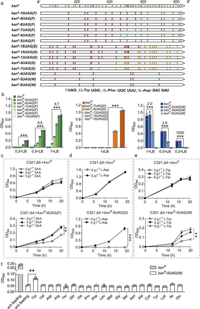 基于上述原理,本团队提出了一种基于人造tRNACUA的氨基酸高产菌株筛选策略。作为概念验证,通过基于生长和/或荧光激活细胞分选(FACS)的筛选,分别从大肠杆菌和谷氨酸棒状杆菌的随机突变库中筛选出L-色氨酸、L-苯丙氨酸和L-天冬氨酸等五种氨基酸的高产菌株,并构建了L-半胱氨酸,L-赖氨酸,L-甘氨酸和L-谷氨酸以及两种非蛋白质氨基酸(5-羟基色氨酸和3-甲基-组氨酸)的选择系统。为了进一步降低筛选标记的设计难度和提高本策略的通用性,在氯霉素抗性基因 cm 的5′末端添加了一段富含UAG的Tag序列,建立了一种改进的筛选标记。这种标记基因可以适用于对所有氨基酸高产菌株的筛选,并且可以通过简单的PCR法改变UAG的数量,来调节筛选强度的大小。随后,还证明了该策略可以被推广至大肠杆菌MG1655,XL10-gold,C321.∆A和谷氨酸棒状杆菌。