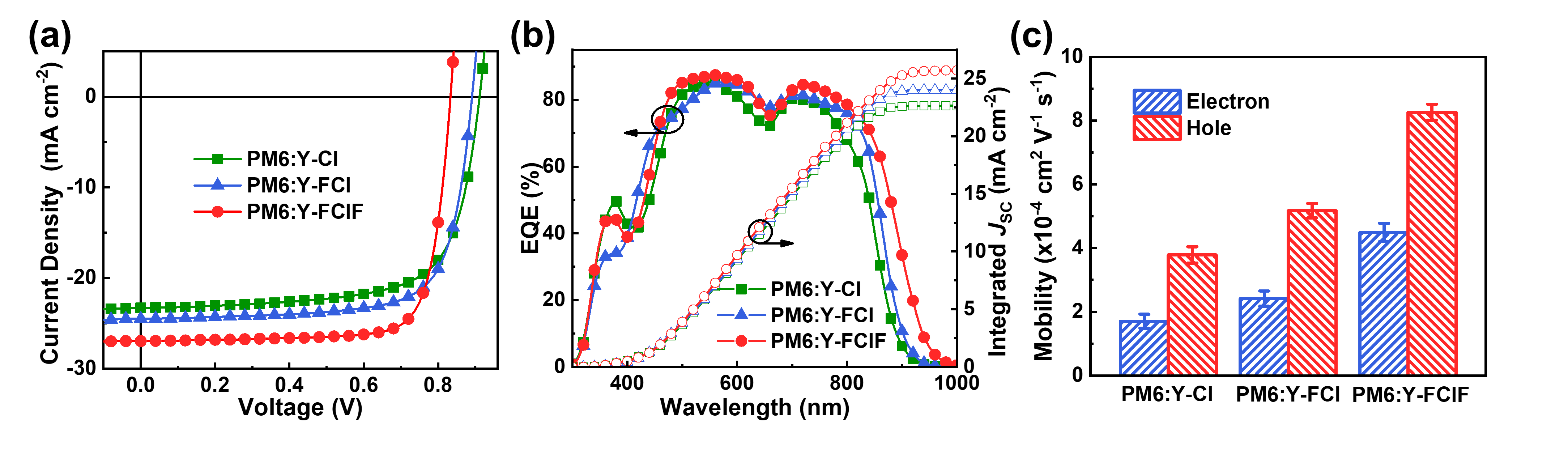 图3. (a)太阳能电池的 J-V 曲线;(b)EQE外量子效率图;(c)载流子迁移率柱状图。