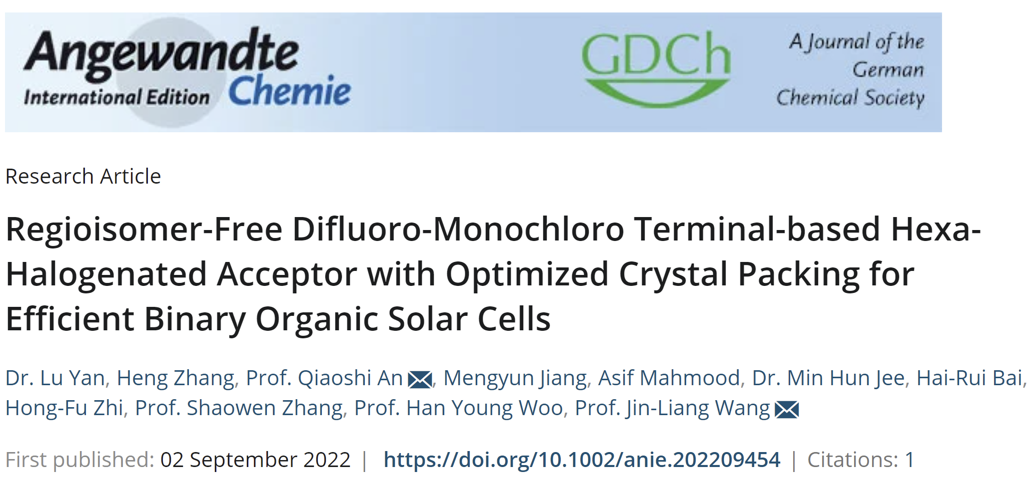 编辑:段凯龙 审核:王振华 阅读次数:近期,北京成品人和一品二品的区别王金亮教授团队在构筑基于区域规整异三卤化端基的高效率有机太阳能电池受体材料方面取得重要进展,相关研究成果发表在国际化学领域顶级期刊《Angewandte Chemie International Edition》上,题为“Regioisomer-Free Difluoro-Monochloro Terminal-based Hexa-Halogenated Acceptor with Optimized Crystal Packing for Efficient Binary Organic Solar Cells”。北京成品人和一品二品的区别为唯一作者通讯单位,化学与化工学院王金亮教授与安桥石特别研究员为该论文的通讯作者,硕士研究生闫禄和博士研究生张恒为论文的共同第一作者。