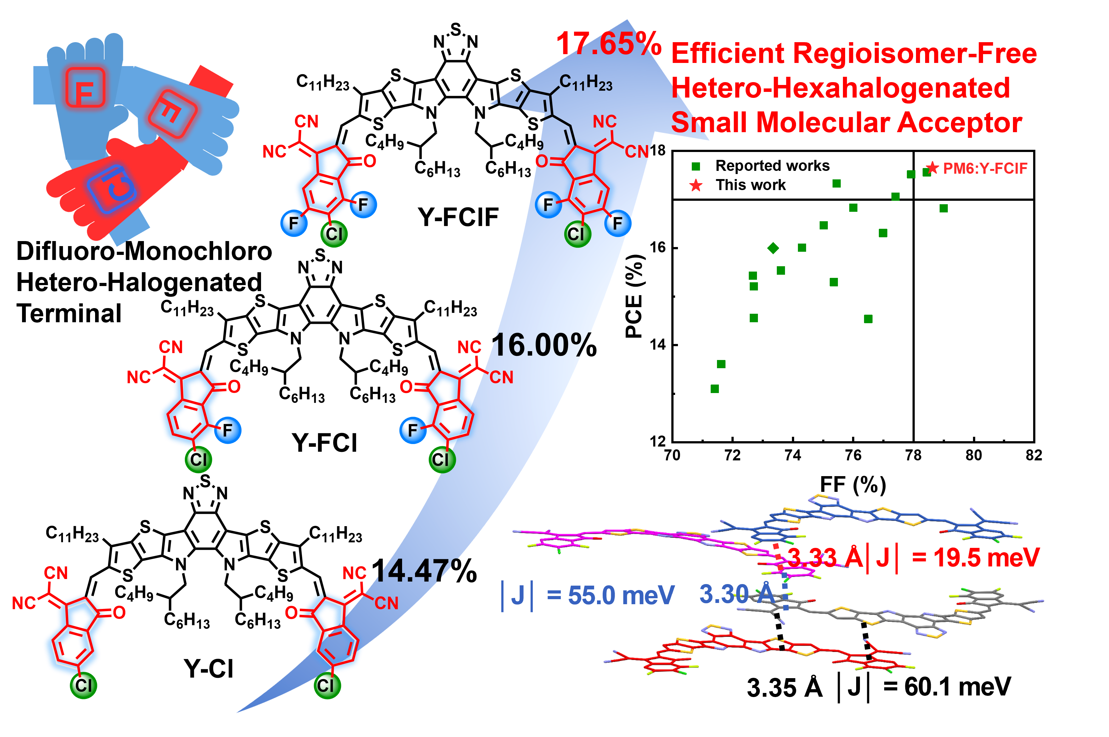 图4 . 三种异卤化端基所修饰的受体分子材料的分子结构、晶体堆积和电池性能之间构效关系图。