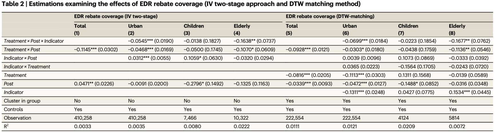 图1:基于激励的EDR措施对异质群体高峰时期用电的影响。(a-d. 描述了不同群体中EDR组和无通知组的电力节约量。纵坐标表示基准日和处理日之间的用电量(以千瓦时为单位)的差异。a.整体效果; b.城市和农村家庭;c.有儿童的家庭;d.有老人家庭)