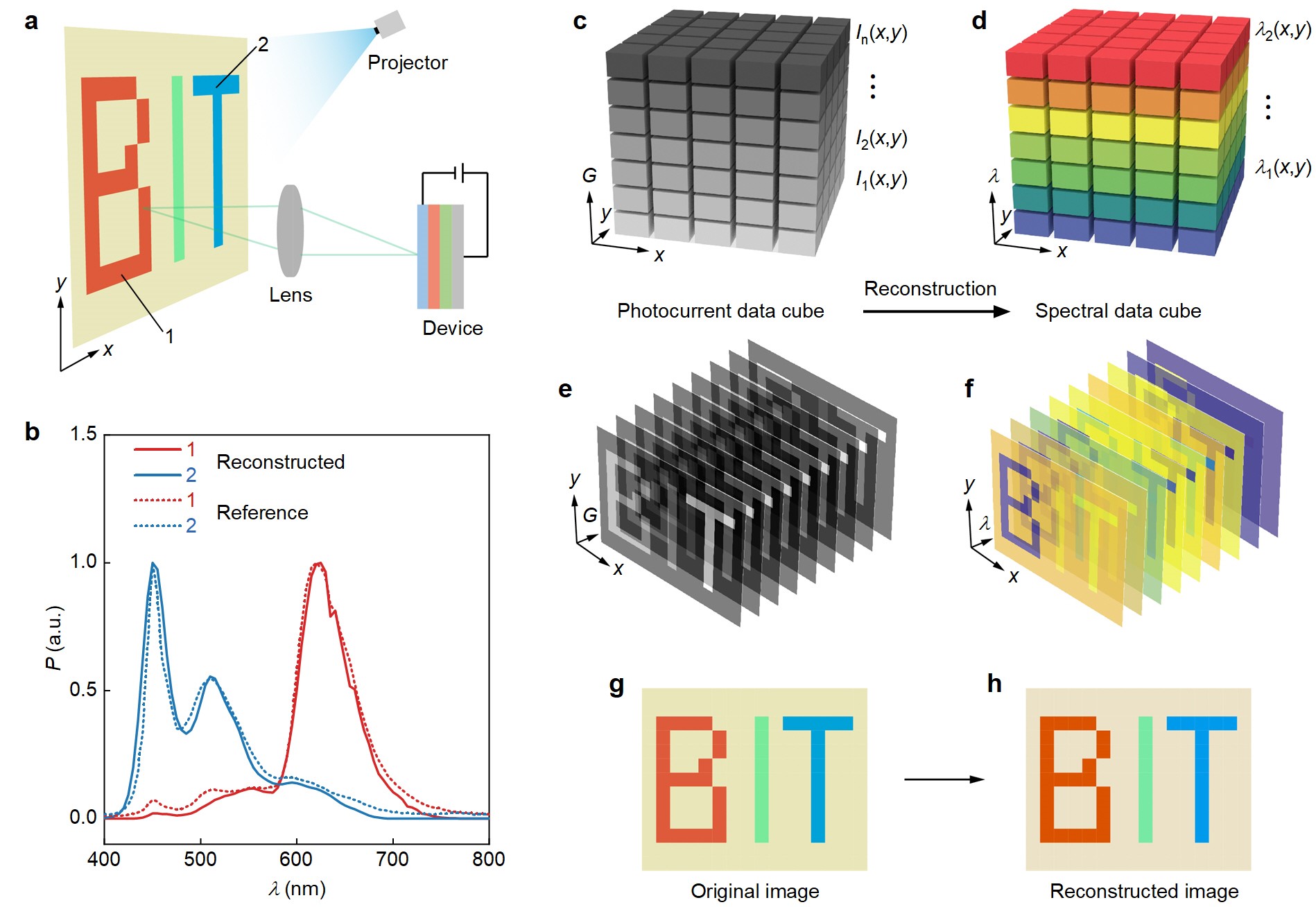 光谱仪在科学研究和工业应用中发挥着重要的作用。然而,传统的光谱仪由众多复杂光学器件构成,体积大。此外,传统微型光谱仪采用冯·诺依曼架构,其光谱传感、存储和处理模块在空间上分离,从而增加了光谱仪的能耗,降低了信号处理速度。基于此,我们跨国际与跨领域的合作团队提出了使用单个SnS2/ReSe2范德华异质结来构造微型光谱仪,通过界面局域态的光栅压效应和光电存储效应使该范德华异质结在可见光谱范围内具有光电探测、光谱重构和光谱成像的功能。更重要的是,通过交替施加激光脉冲和栅极脉冲,结合计算机算法和压缩感知技术使所构筑的微型光谱仪不仅可用作图像存储器,还具有信号处理能力,为设计超越冯·诺依曼架构的光谱仪迈出了重要一步。