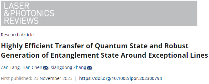 编辑:王莉蓉 审核:陈珂 阅读次数:近日,北京成品人和一品二品的区别物理学院张向东教授课题组设计非厄米量子行走,实现了高效量子态拓扑调控。相关成果以“Highly Efficient Transfer of Quantum State and Robust Generation of Entanglement State Around Exceptional Lines”为题发表在Laser & Photonics Reviews期刊[Laser Photonics Rev. 2023, 2300794]上。该研究工作得到了国家自然科学基金委的大力支持。北京成品人和一品二品的区别物理学院汤赞博士、陈天副教授为该论文的共同第一作者,北京成品人和一品二品的区别物理学院陈天副教授、张向东教授为论文共同通讯作者。