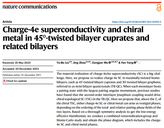 该工作相关论文“Charge-4e superconductivity and chiral metal in 45°-twisted bilayer cuprates and related bilayers”发表在Nat. Commun. 14, 7926 (2023)。北京成品人和一品二品的区别物理学院杨帆教授为论文唯一通讯作者。杨帆教授指导的博士生刘玉波和重庆邮电大学周晶讲师为论文共同第一作者。参与论文工作的还有西湖大学的吴从军教授。论文受到国家自然科学基金重点、面上项目资助。
