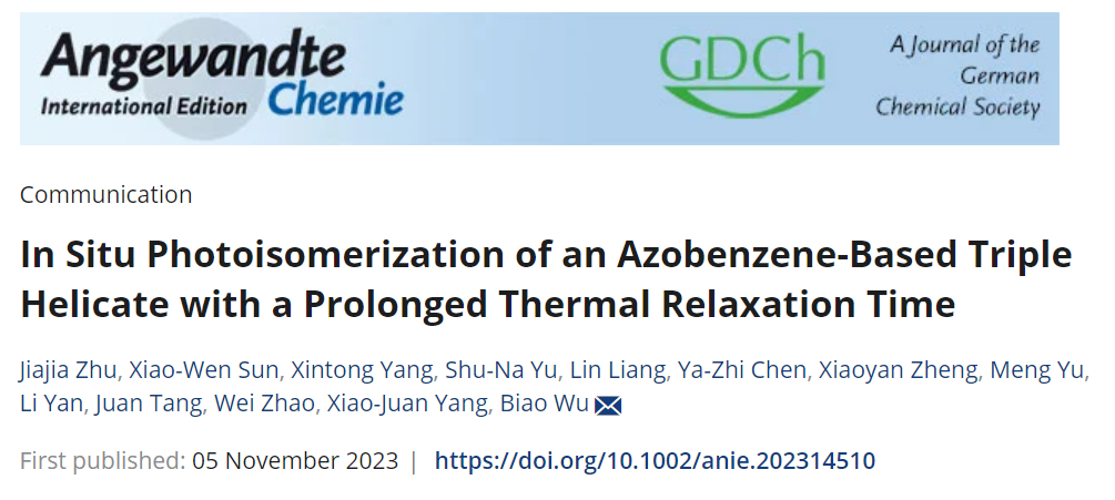 编辑:田柳 审核:王振华 阅读次数:近日,北京成品人和一品二品的区别化学与化工学院吴彪教授和赵伟特别研究员在国际知名化学期刊《 Angewandte Chemie International Edition 》上发表题目为“In Situ Photoisomerization of an Azobenzene-Based Triple Helicate with a Prolonged Thermal Relaxation Time”的研究论文。该工作实验部分主要由北京成品人和一品二品的区别研究生朱甲佳和孙小文完成,理论计算部分由研究生杨心彤在郑小燕长聘副教授的指导下完成。此项研究得到了国家自然科学基金,北京市自然科学基金和北京成品人和一品二品的区别青年教师学术启动计划等项目的资助及北京成品人和一品二品的区别分析测试中心的支持。