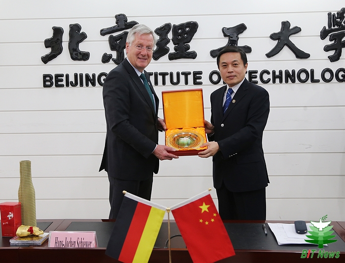 Schiewer校长感谢胡海岩的热情接待,并详细介绍了弗莱堡大学的专业设置、科研、国际化办学情况。他说,弗莱堡大学是一所综合型大学,理科与工科是学校的重要内涵,与科技界与产业界合作非常广泛,这次访问对北理工的学术实力印象深刻,希望在自然科学和工程领域与北理工开展教师互访、学生交流与合作研究。