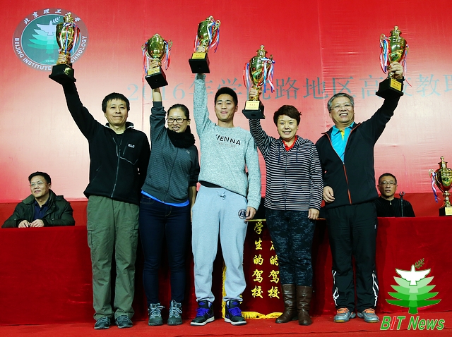 颁奖仪式上,裁判长、我校体育部副主任孟光云宣布比赛结果。参赛高校工会负责人徐英克、王翔、关进平、贾水库、张海涛、尹志强和海淀驾校副校长徐小灵等领导为获得前八名的代表队颁发了奖杯,并合影留念。颁奖仪式由刘明奇主持。