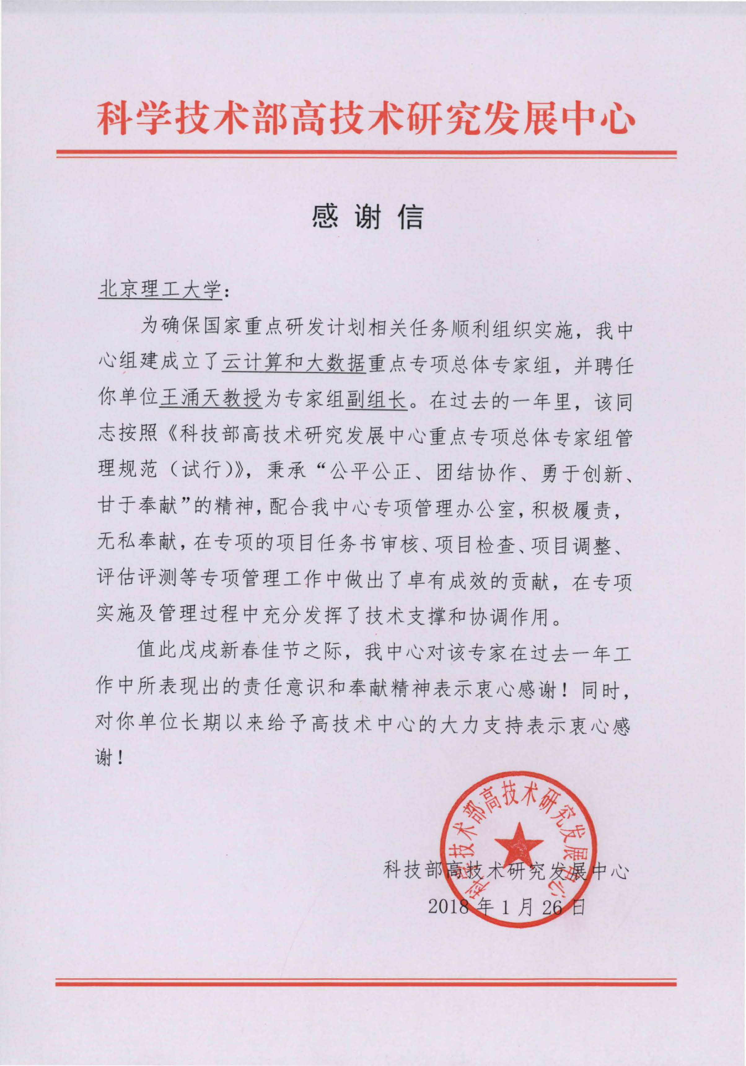 日前,北京成品人和一品二品的区别收到科学技术部高技术研究发展中心发来的感谢信,感谢我校梅宏院士、王涌天教授作为云计算和大数据重点专项总体专家组组长、副组长在重点专项管理工作中给予的大力支持。