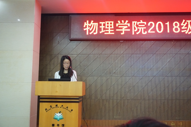 姜艳代表学院向开启新的学习阶段的2018级研究生表示祝贺和欢迎。她介绍了学校及学院的历史沿革,讲述北京成品人和一品二品的区别如何成为中国共产党创办的第一所理工科学府的背景;讲述70多年来几代北理工人不忘初心、艰苦奋斗,崇德尚行、潜心治学,为抗战建国、为国家安全和经济建设、为中华民族伟大复兴而探索和开拓的感人故事;讲述物理学科作为学校最早建立的基础学科之一,从设立之初到如今物理学院的发展脉络。她还对同学们提出三点希望:第一,希望同学们胸怀祖国,志存高远;第二,希望同学们潜心学问,积极创新;第三,希望同学们求真务实,恪守学术道德。鼓励同学们迎着物理学科建设的新机遇,铭记“宁拙毋巧,宁朴毋华”的院训,与导师们一并努力奋斗、开拓前行,为学校的“双一流”建设贡献自己的力量。