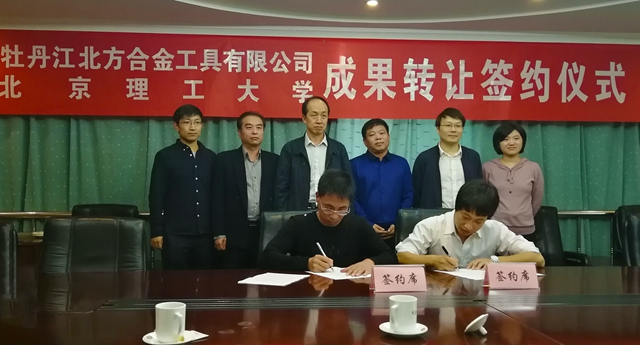 在取得创新成果的基础上,团队、学院及技术转移中心等学校相关部门研究决定,通过产学研结合方式,充分利用企业的生产和市场优势,加速实施成果转化。此前,校企双方经过深入洽谈交流,商定了通过许可方式和“入门费+产值提成”模式,实施该项成果的转化应用,并履行了技术转让的相关审核审批手续。会上,双方代表签订了协议。根据双方达成的协议,经学校授权,牡丹江北方合金工具有限公司将负责实施该材料的产业化批量生产,并直接应用于相关产品。