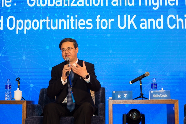 在校长论坛环节,张军围绕“全球化时代中英两国高等教育面临的机遇和挑战”议题作主旨发言。他指出,在全球化的环境下,中英贸易往来和文化交流快速发展,两国的教育合作进入最好的时期,同时面临着新的挑战。一是学生交流不平衡,中国赴英国的留学生数量远远高于英国来中国的留学生数量;二是留学生质量层次不齐,高水平留学生占比较少;三是信息技术发展带来了教育模式的变革,思辨性课堂、实践性课堂对传统的教育产生巨大冲击。