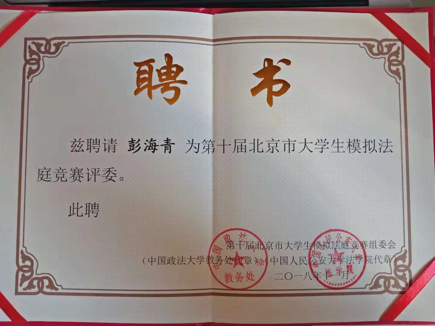 第十届北京市大学生模拟法庭竞赛时间为2018年11月10日至24日,来自京津冀40所高校的228名学生参赛。11月10日,第十届北京市大学生模拟法庭竞赛正赛开幕式暨评委聘任仪式在中国人民公安大学举行。来自北京市各级人民法院、人民检察院、著名律师事务所以及各参赛高校的50名评委参加仪式,领取聘书并进行了简短评审培训。法学院诉讼法学研究所所长彭海青副教授受聘担任第十届北京市大学生模拟法庭竞赛评委。这是我院教师首次受聘担任该赛事评委。