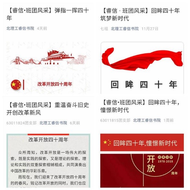在新媒体育人的热潮下,为纪念改革开放40周年,书院在官方公众号为各个班级设立“班团风采”专栏。开设以来,共收集20余篇有关改革开放40周年的文章投稿。