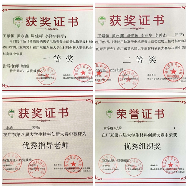 编辑:邵泽 审核:刘艳 阅读次数:2018年12月8日至9日,由广东省材料研究学会主办的第八届广东大学生材料创新大赛在广东省佛山市佛山科技学院举行,北京成品人和一品二品的区别材料学院海“钠”百川代表队参与比赛并取得无机非金属赛区分决赛一等奖,总决赛二等奖的优异成绩,谢嫚老师获得优秀指导老师奖,北京成品人和一品二品的区别材料学院获优秀组织奖。项目成果还在路演环节被今日头条、东方财富网等主流媒体报道。