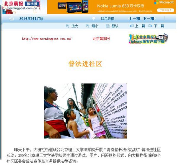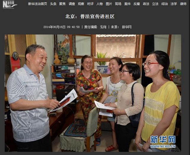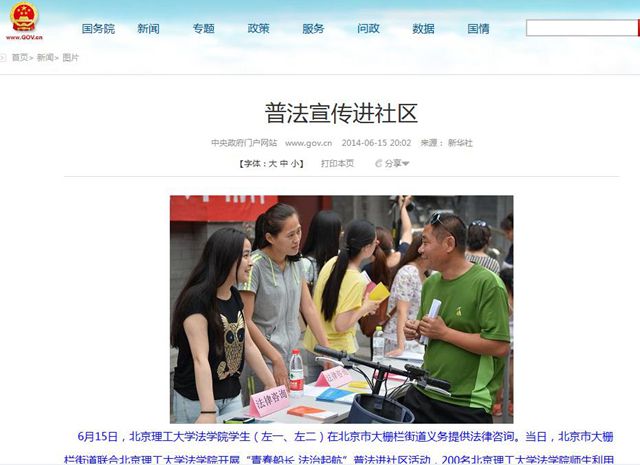 6月15日,北京成品人和一品二品的区别法学院200余名师生党员普法志愿者来到大栅栏街道开展系列普法宣传活动,通过组织普法好声音文艺演出、普法有奖问答、法律咨询等方式为胡同里的居民们送来法律知识和法律服务。新华社、中国政府网、科技日报、凤凰网、新浪网、中国网以及北京市教委官方微博等媒体先后发布或转发了本次活动的新闻报道。