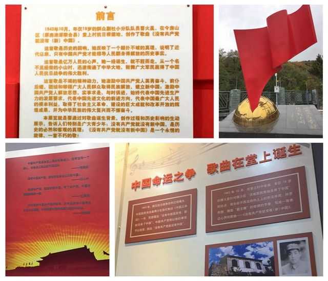 “没有共产党就没有新中国”纪念馆,位于房山区霞云岭乡堂上村,1943年10月,中共党员曹火星同志在此创作了这首脍炙人口的不朽歌曲——《没有共产党就没有新中国》。当年,堂上村曾隶属于八路军邓华支队开辟的平西抗日根据地。平西是中国共产党人及其所领导的八路军新四军在中华民族生死存亡的关键时刻,挺身而出,共赴国难,积极倡导抗日民族统一战线,建立敌后根据地,实行全民族抗战的一个缩影。置身于平西抗日根据地的曹火星,对中国命运由谁决定有着鲜明的答案。《没有共产党就没有新中国》这首歌唱出了一个历史铸就的结论,同时也唱出了人民的心声,唱出了一个历史真理。2001年,当地政府对《没有共产党就没有新中国》词曲创作地进行了修葺整治,建立了《没有共产党就没有新中国》词曲创作地陈列馆,并在院内建设了以“没有共产党就没有新中国”为主题的纪念雕塑。 2006年6月26日,新建“没有共产党就没有新中国”纪念馆。纪念馆采取依山就势、单层连体的建筑方式,体现平西山地民居风格,分为A、B、C三个区域。大型主题展览共分三部分,在展览艺术表现上综合运用文字、摄影、绘画、浮雕、蜡像、幻影成像等传统与现代相结合的艺术手段,全部展览展出照片800幅,制作油画1幅,大型浮雕1幅,蜡像1个,幻影成像1幅。