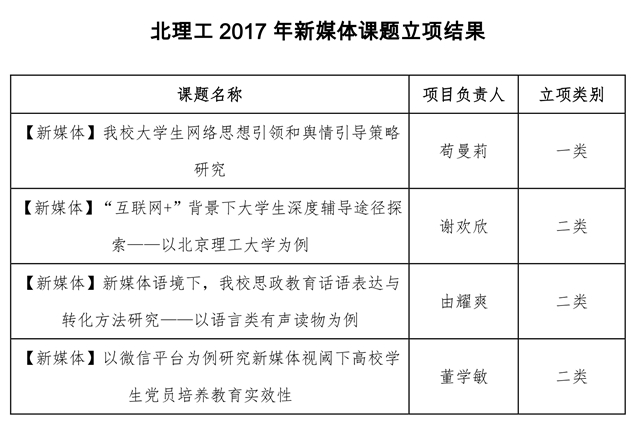 积极开展新媒体思政课题研究,撰写网络思政教育工作论文。2016年9月初,为探索思政教育的有效途径,拓展渠道,更有效地开展网络思想政治教育工作,学生工作处组织开展课题研究,经专家评审、课题交流、反馈修改等环节,立项了一批新媒体思政研究课题。此外,各学院积极撰写网络思政教育工作论文,管理与经济学院张瑞老师撰写的论文《新媒体视角下高校网络文化育人功能探析——以17所高校微信公众号为例》,宇航学院方蕾、魏昕林老师撰写的论文《对新媒体环境下高校辅导员思想政治教育话语权的探究与思考》分获北理工2016年辅导员学术活动月思政论文一等奖、二等奖。
