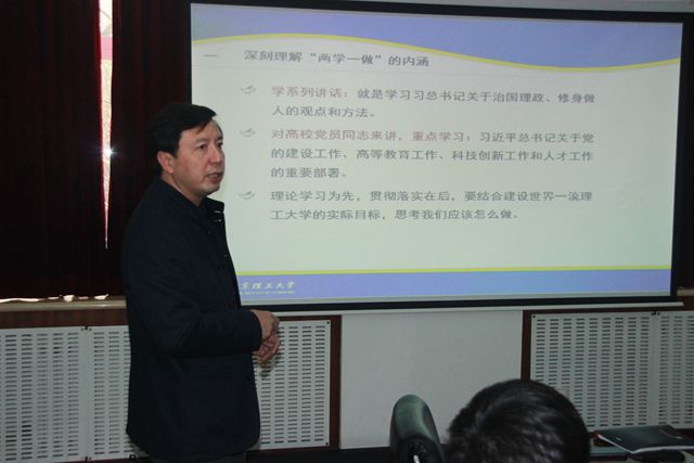 为了让大家对“两学一做”内涵有更深刻认识,陈杰副校长用两个微视频《习近平用典--为政之要》和《习近平用典---图难于其易》,生动讲解了习总书记关于领导干部治国理政、修身做事的论述。随后,陈杰副校长带领大家学习了习近平总书记近期在全国高校思想政治工作会议,全国科技创新大会及知识分子、劳动模范、青年代表座谈会上的系列讲话。陈杰副校长强调,习近平总书记关于全国高校思想政治工作的重要讲话为高校培养什么样的人、如何培养人以及为谁培养人指明了方向,办好高校、办出世界一流大学,必须牢牢抓住全面提高人才培养能力这个核心点,并以此来带动高校其他工作。科技兴则民族兴,科技强则国家强,创新始终是一个国家、一个民族发展的重要力量,也始终是推动人类社会进步的重要力量。广大党员要深刻理解掌握这些讲话的丰富内涵和核心要义,用以武装头脑,指导实践,推动工作。