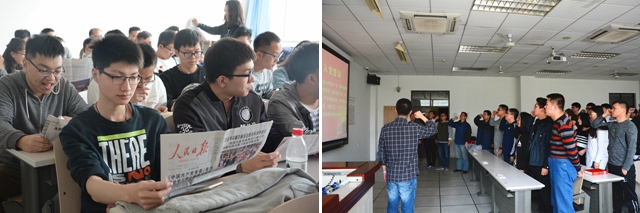 左哲老师带领大家一同阅读了《人民日报》《习总书记系列讲话读本》等文刊,并向大家抛出了一个问题:“‘四讲四有’应该如何解读?”这一疑问在台下引起了激烈的讨论。学生支部书记鲁怡表示:“‘四讲四有’第一条讲政治,有信念,就是要求共产党员,尤其是年轻的共产党员要不断坚定理想信念,永远牢记过去,反思现在,展望未来,这正是我们此次党日活动的目的所在。”