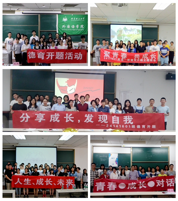 在本次德育开题报告会前期,辅导员通过开年级大会、班长支书会以及高年级学生开题经验分享会的方式动员学生参与,各班班委也借鉴上一届学生开题会的经验,制定了详细周密的策划,各班分别以“分享成长,发现自我” “成长,遇见未知的自己” “人生、成长、未来——让梦想起航” “聚青春,共成长”“青春∙成长∙对话”等为主题,对大一上学期的学习、生活进行了回顾、总结和反思,对“未来是什么?”、“未来和过去的关系”等问题进行了探究,并结合专业特点和自身兴趣对未来进行了展望。报告会中,各班纷纷以张贴海报、定制班服、条幅签名等形式来展现班级特色,表达对于班级的热爱。同学们各展所能,相互学习,开题报告中汇入了真挚的情感,充分展示了外国语学院16级本科生积极进取的精神风貌和孜孜不倦的求学态度。