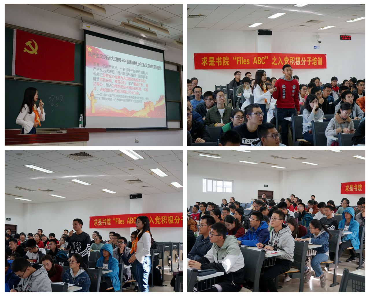 为教育引导学生树立共产主义远大理想和中国特色社会主义共同理想,增强学生的中国特色社会主义道路自信、理论自信、制度自信、文化自信,立志肩负起民族复兴的时代重任,求是书院“Files ABC”之第一期入党积极分子培训班于11月18日在理科教学楼402室开班,经个人提交入党志愿书申请、接受组织谈话、团支部推荐等程序产生的90名入党积极分子参加了本期培训。